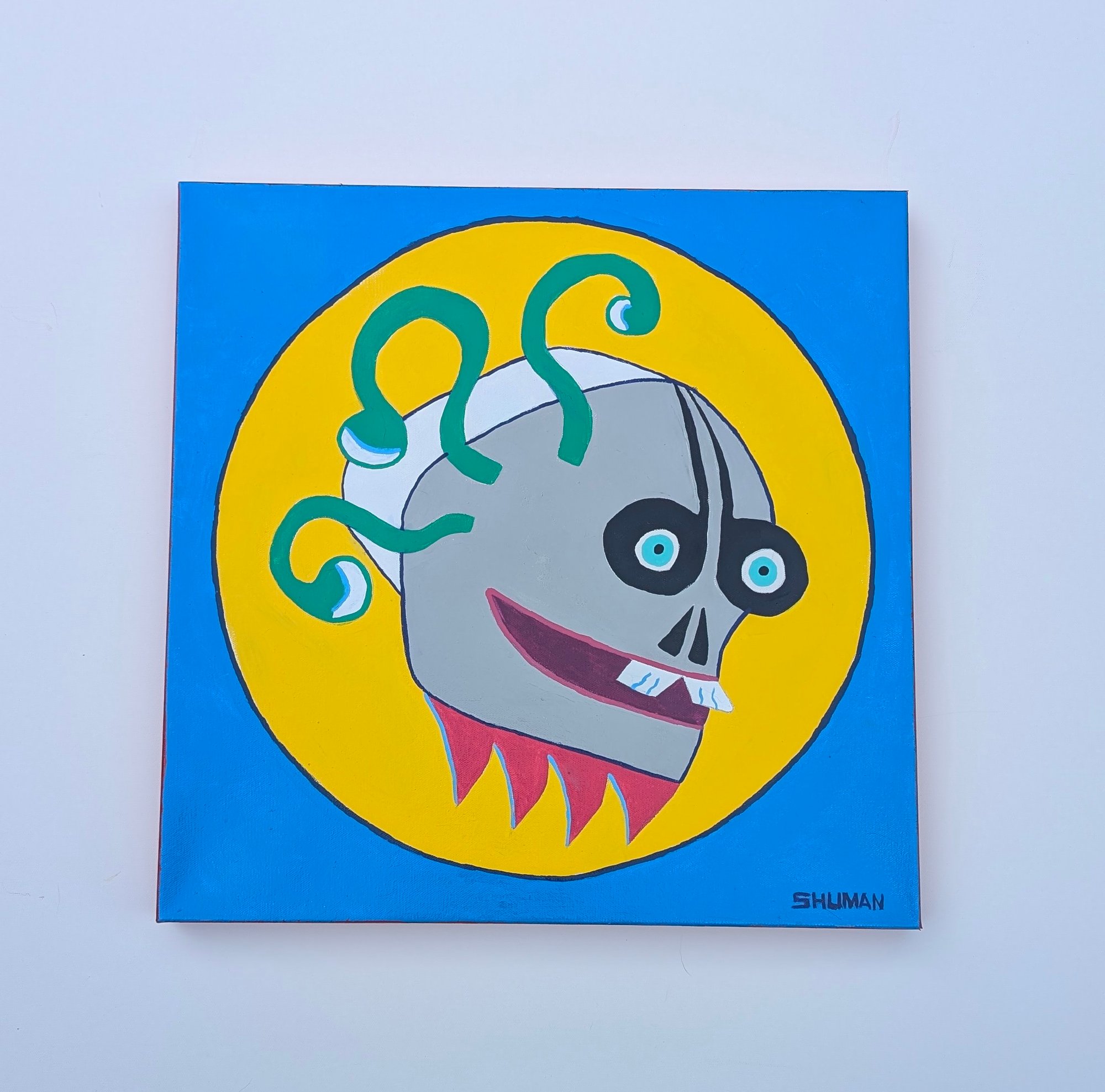 This super amazing enamel painting features Snakey Jake, part skeleton part Medusa. Shakey Jake will bring complete joy to your above. Painted using enamel oil paint. This awesome painting measures 20" x 20" and is 1 1/2 inch thick. Take home Shakey Jake today.